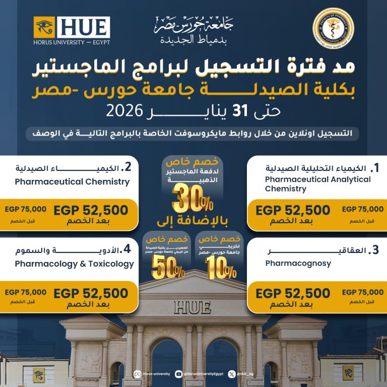 إعلان هام | يسر كلية الصيدلة جامعة حورس – مصر ان تعلن عن مدّ فترة فتح باب التسجيل للدراسات العليا (الماجستير)